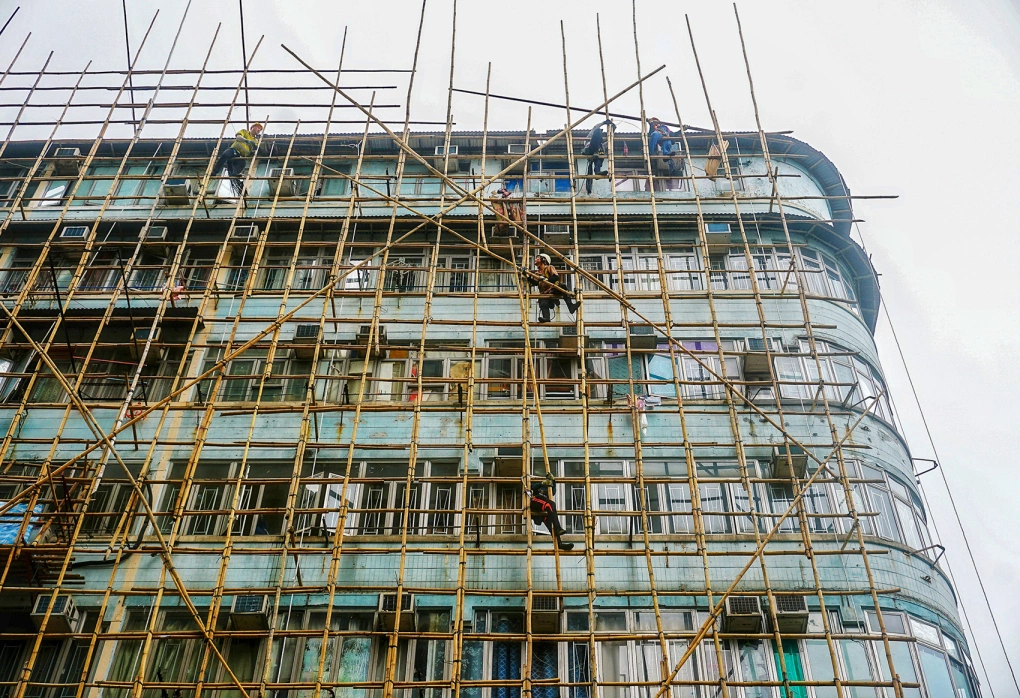 Những giàn giáo với nhiều thanh tre đan cài, mỗi thanh buộc chặt bằng dây nhựa hiện diện khắp nơi tại Hong Kong.
